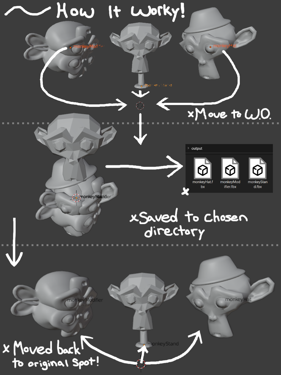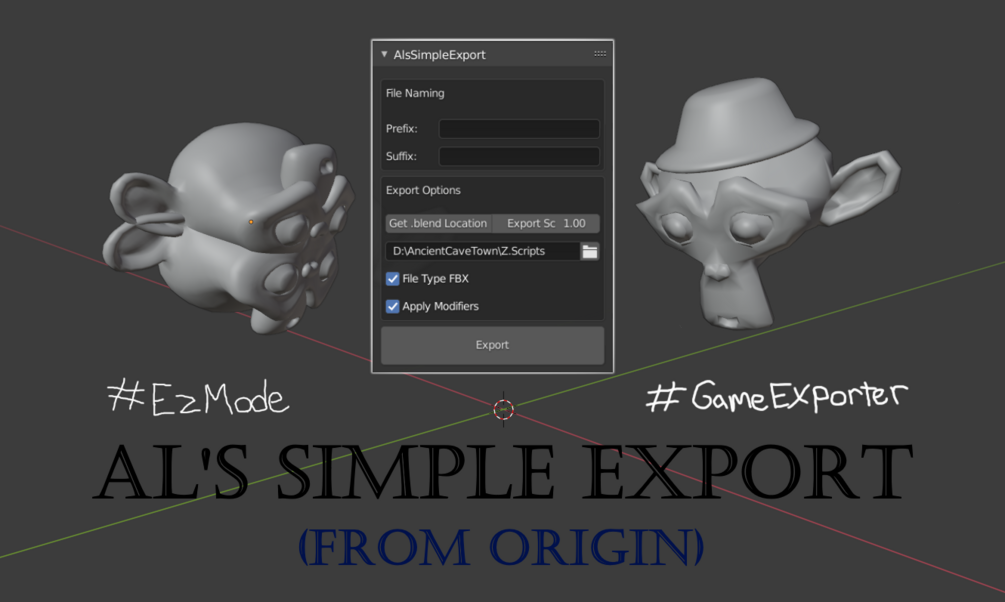 Are you sick and tired of moving all of your meshes to 0,0,0 in order to export them to another engine correctly??? Ever been overwhelmed by Blender's default export menu?? Well no more!! Inspired by Autodesk MAYA's game exporter, I decided to take it upon myself to learn Blender's Python API and create my own version of it! Export meshes from anywhere in your scene, in any collection. All you'd need to do is select the meshes you wanna export, configure settings and set your export directory (or use your .blend file location with a simple button click), and click Export!