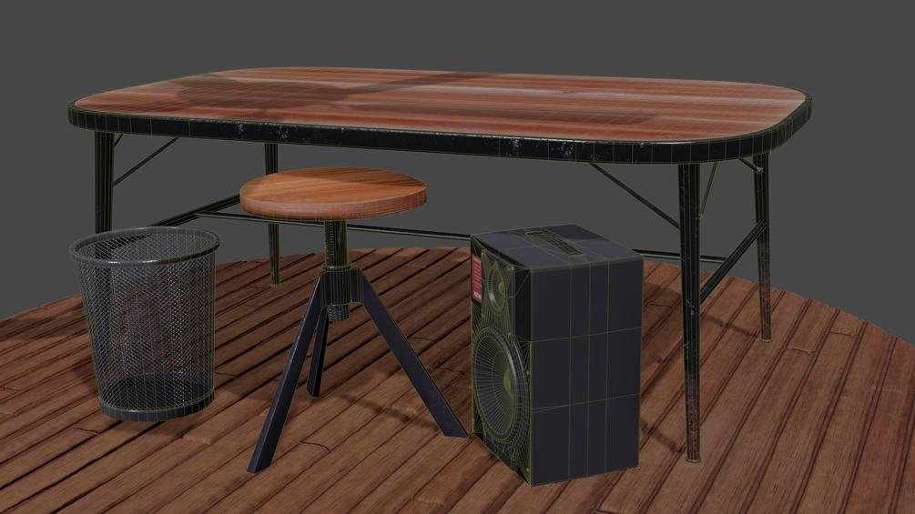 Asset Pack #1 - Cozy Corner - includes 5 models (Stool, table/desk, grated trash bin, ceiling fan, speaker) and 1 tile-able material from my Musician's Motel Room scene (Wood planks). The meshes and textures included are as pictured. The demo scene I used to capture these renders is also included.