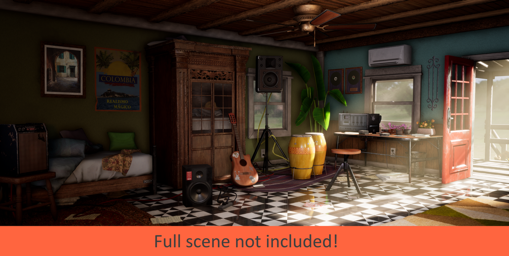 The environment was created in UE4, and so BC is Albedo/Diffuse, and you could use the HRAO packed map(Red = Height, Green = Roughness, Blue = Ambient Occlusion) to get a specular map with each material if necessary. The trash can uses the alpha channel of the basecolor map (TrashCan_BC) to achieve the mesh/grating detail. The ceiling fan comes in 1 FBX file, but the center and the fan blades are separated so that you can easily configure the fan blades to spin. All models and textures are optimized for use in-game, but do not come with LODs or collisions, but assets are simple enough where this shouldn't be a performance bottleneck.